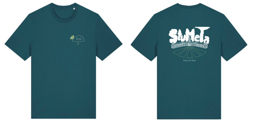 This year, you again had the option to order a T-shirt for 15€ during registration. The color of the T-shirt is based on the KIT color scheme. The logo features Karlsruhe Palace with the characteristic rays beneath it, symbolizing Karlsruhe as the fan-shaped city. Below, you can see the design for the StuMeTa 2026 T-shirt.