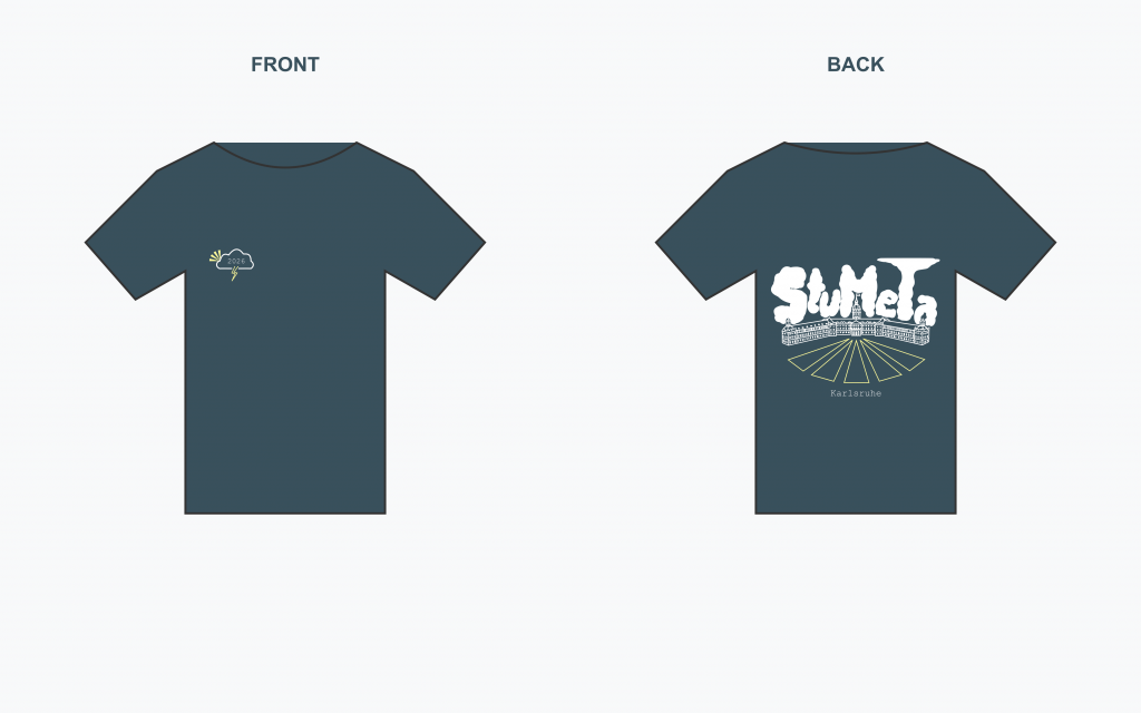 This year, you will again have the option to order a T-shirt for 15€ during registration. The color of the T-shirt is based on the KIT color scheme. The logo features Karlsruhe Palace with the characteristic rays beneath it, symbolizing Karlsruhe as the fan-shaped city. Below, you can see the design for the StuMeTa 2026 T-shirt.